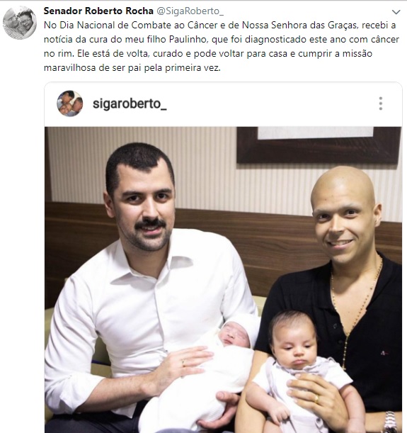 O senador Roberto Rocha (PSDB), que disputou o Governo do Maranhão nas eleições deste ano, recebeu uma excelente notícia nesta semana com relação a luta que um de seus filhos travava contra o câncer.