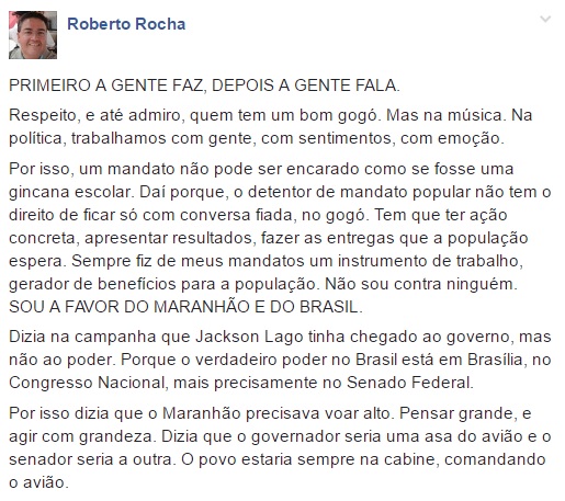 Veja abaixo a curta entrevista de Roberto Rocha, que mais uma vez parece ter acertado na moleira do governador comunista.