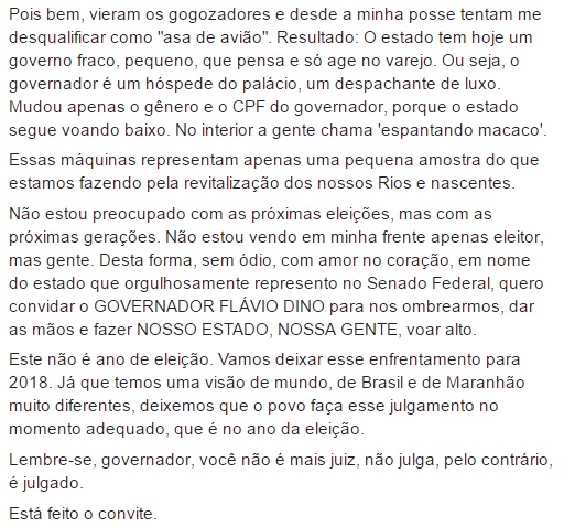 Entretanto, como todos que ousam questionar as atitudes, mesmo equivocadas e contraditórias, de Flávio Dino, o senador maranhense passou a ser um dos principais alvos dos asseclas do comunista, que quase nunca se preocupam em responder as críticas, mas se limitam apenas, talvez por total falta de argumento e capacidade, a tentar destruir a imagem de quem critica.