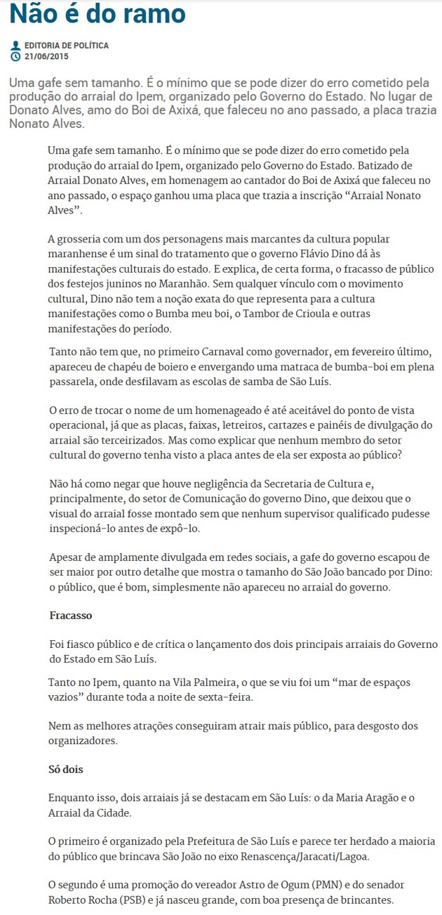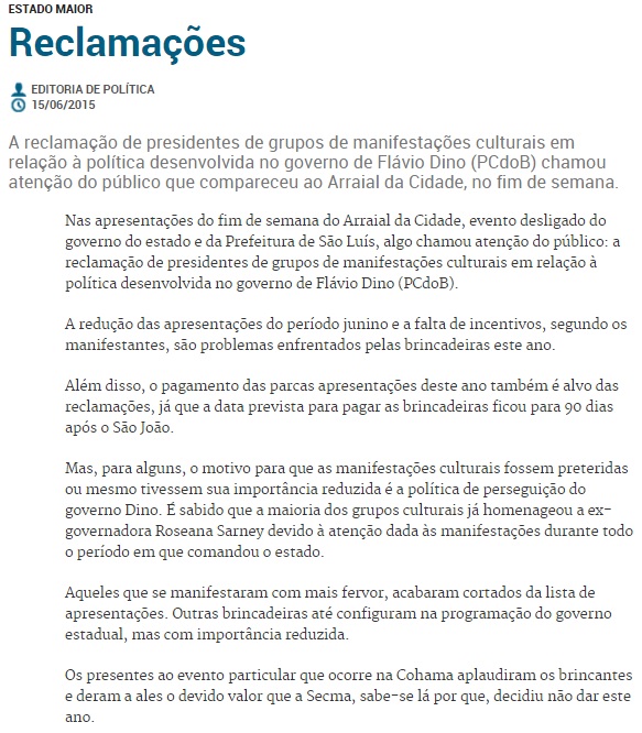 No entanto, pelo que se percebe o desconhecimento não fica resumido apenas ao erro da grafia. No release distribuído pelo Governo Flávio Dino sobre a abertura do São João 2015, o desconhecimento da cultura maranhense segue evidenciado.