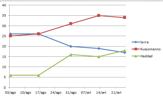 Segundo a pesquisa Datafolha, divulgada na quarta-feira (29), encomendada pela TV Globo e pelo jornal Folha de São Paulo, Russomano manteve o patamar da pesquisa anterior, já Serra caiu bastante e Haddad cresceu e já encosta no tucano.