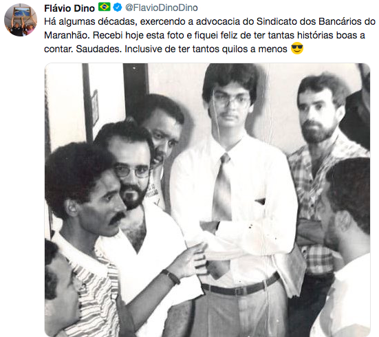 Tudo começou quando Dino postou uma foto antiga sua, da época do Sindicato dos Bancários, e no registro estava também o prefeito Domingos Dutra, mas que não foi citado por Dino, assim como os demais membros da foto.