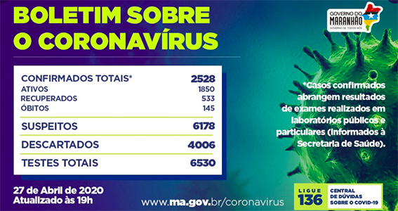 Os números atuais do novo coronavírus no Maranhão, são: 2.528 casos, 145 mortes, 533 pessoas recuperadas, 6.178 suspeitos e 62 municípios com registro da doença.